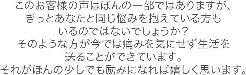 しかしよく考えてみてください。今後もそのツラい痛みを我慢し続ける人生で本当にいいのですか?