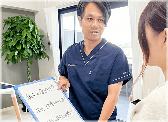 たくさんの方が抱えているそのツラい腰痛に終止符を打って欲しいという思いで、一人ひとりのお客様に心を込めて毎回本気で施術を行っています。