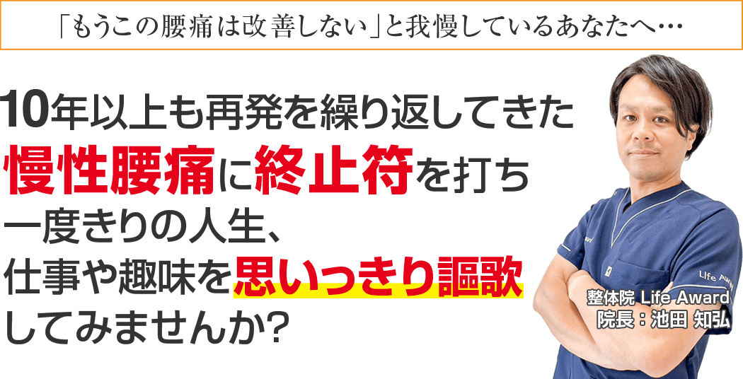 国家資格を持ち、最先端の技術で、たくさんの腰痛で悩んでいる方から支持され、あなたのツラい腰痛に全力で向き合ってくれる北九州市で唯一の腰痛専門整体院 LifeAwardに来院し、もう二度とツラい痛みを我慢することのない人生を手に入れる道。