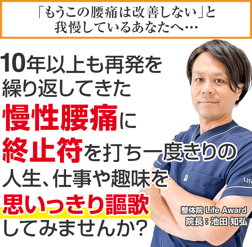 もしあなたが今、上記のようなお悩みがあり、心のどこかで少しでも良くなりたい!と思われているなら、整体院 LifeAward に来院し、根本から痛い・ツラい腰痛を一緒に改善しませんか?