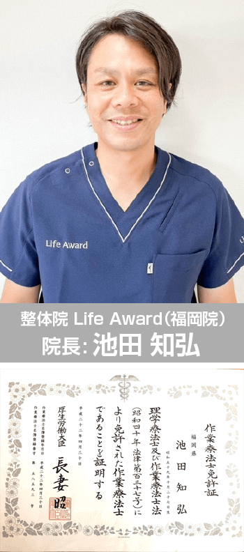 慢性腰痛専門整体院 Life Award 院長 池田知弘です。福岡県北九州市出身で地元が大好きで、現在も北九州市に住んでいます。
