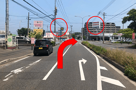 1学園大通りを浅川方面に向かって北上し、びっくりドンキー・NISSAN の信号を右折