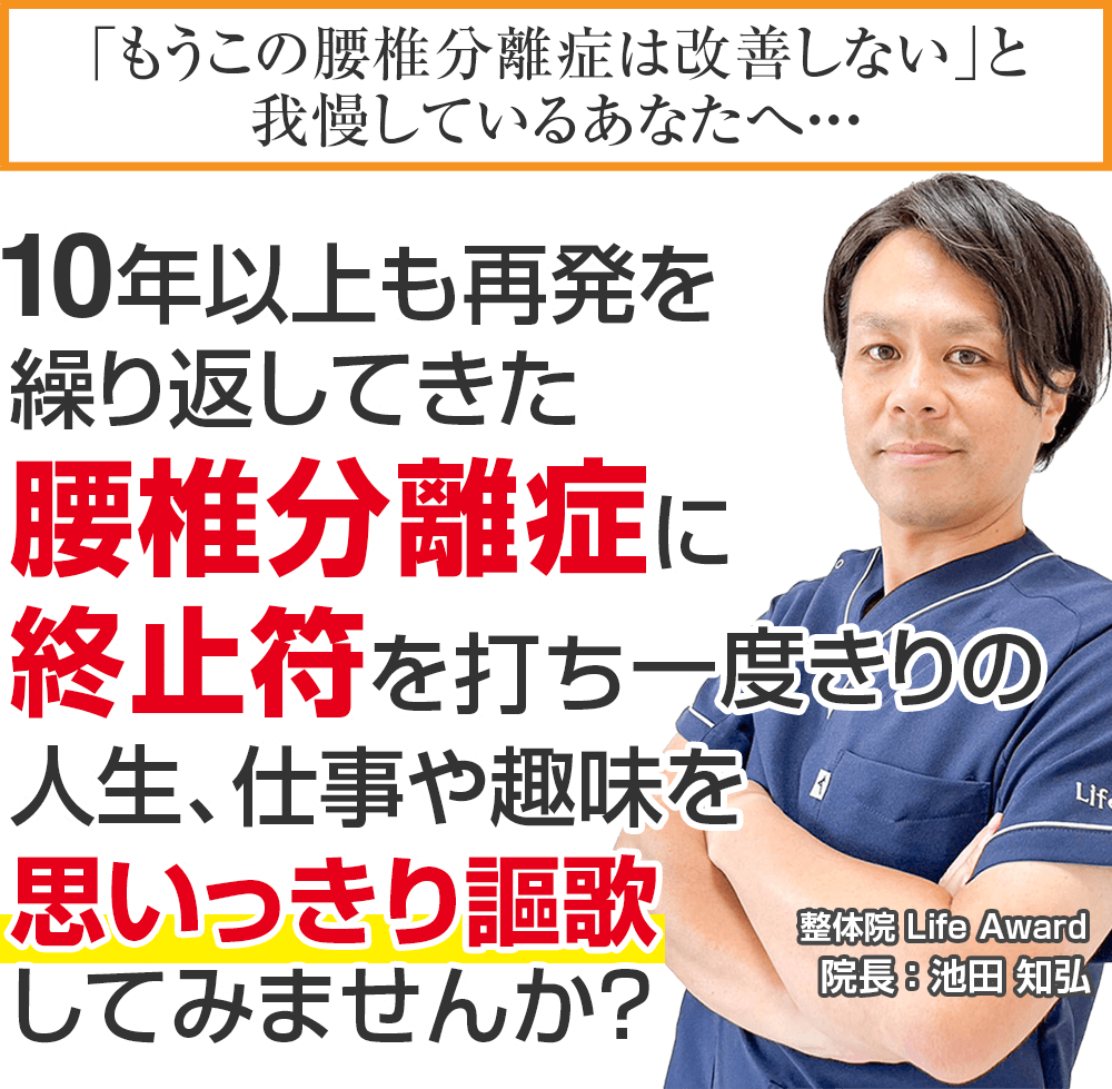 国家資格を持ち、最先端の技術で、たくさんの腰椎分離症で悩んでいる方から支持され、あなたのツラい腰椎分離症に全力で向き合ってくれる北九州市で唯一の腰椎分離症専門整体院 LifeAwardに来院し、もう二度とツラい痛みを我慢することのない人生を手に入れる道。