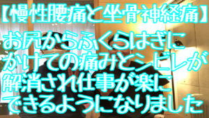 右腰の奥の痛みとお尻からふくらはぎの外側にかけて痛みとシビレの悩みが解消され、仕事がメチャクチャ楽にできるようになりました!